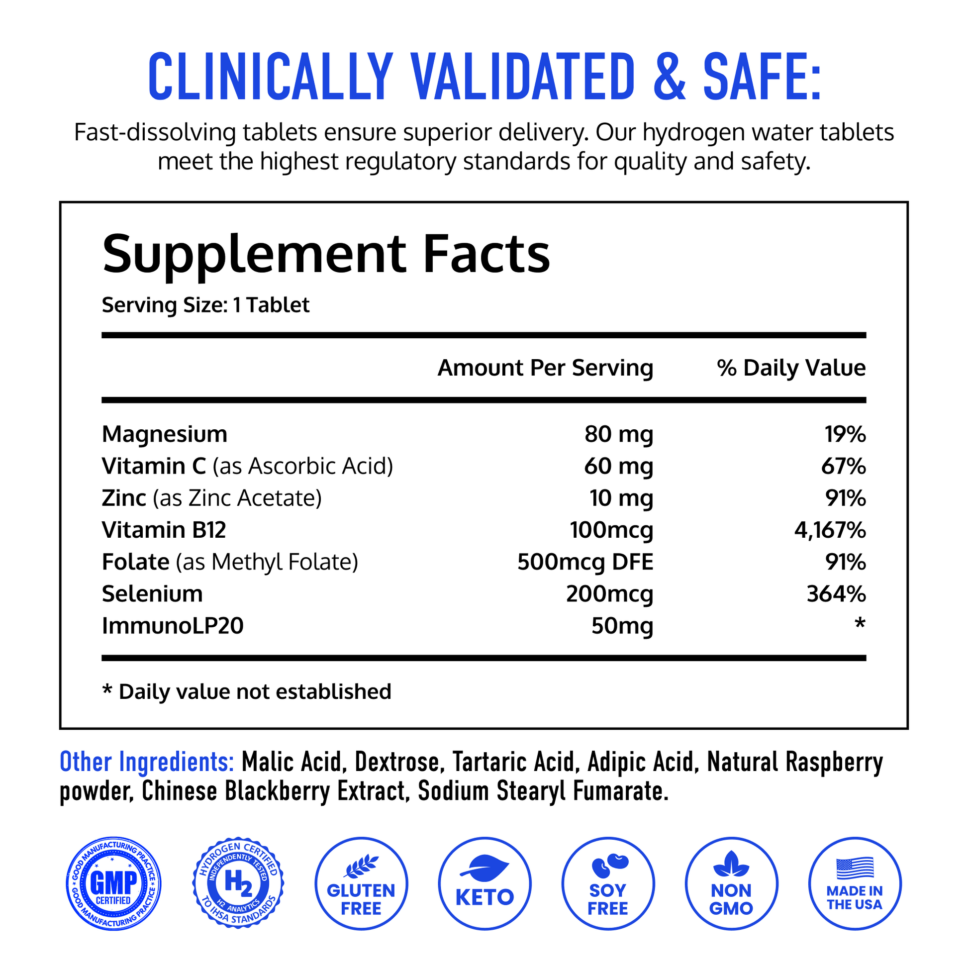 Fast-dissolving tablets ensure superior hydrogen and micronutrient delivery. Our hydrogen water tablets meet the highest regulatory standards for quality and safety. Gluten and soy free, keto friendly, and Non-GMO. Good Manufacturing Practice (GMP) certified. Hydrogen Certified to IHSA standards. Made in the USA.