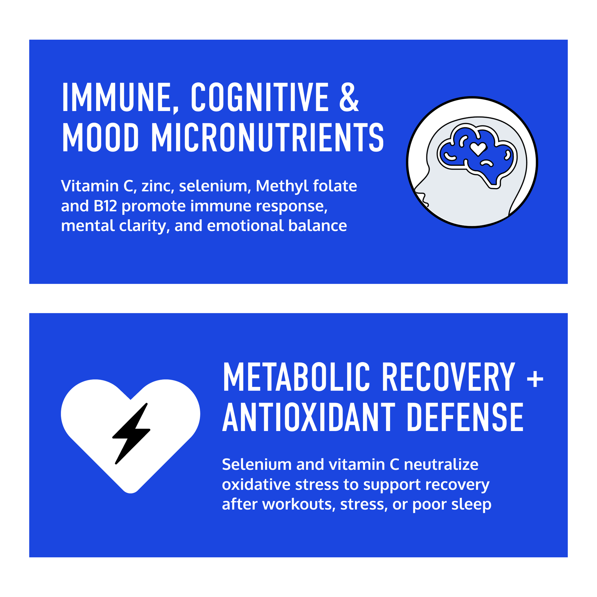 Vitamins and minerals like B12, zinc, folate, selenium, and C are all included at meaningful doses, in forms that are bioavailable and research-backed.
